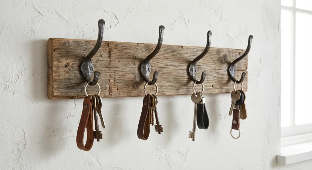 Make a small wood strip. Put 4 or 5 hooks on it. Hang it near door. Problem solved.